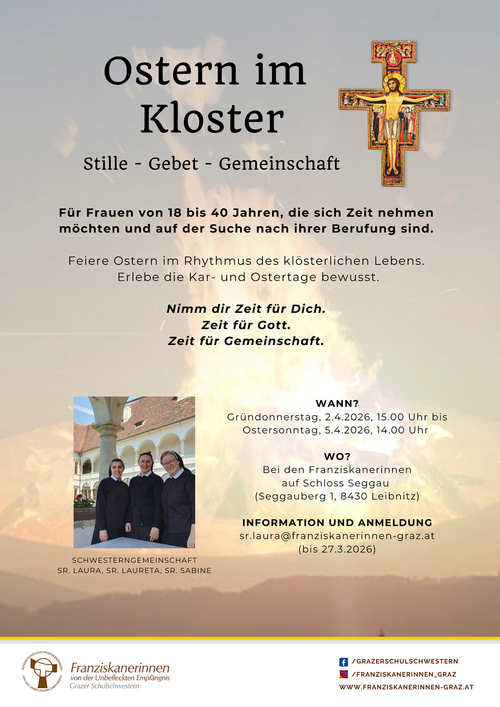 Bist du eine Frau zwischen 18 und 40 Jahren, möchtest dir Zeit nehmen und deiner Berufung nachspüren? Dann laden wir dich herzlich ein, Ostern im Kloster zu verbringen. Erlebe das Osterfest bewusst – im Rhythmus des klösterlichen Lebens und der besonderen Liturgie der Kar- und Ostertage. Tauche ein in eine Atmosphäre von Stille, Gebet und Gemeinschaft.