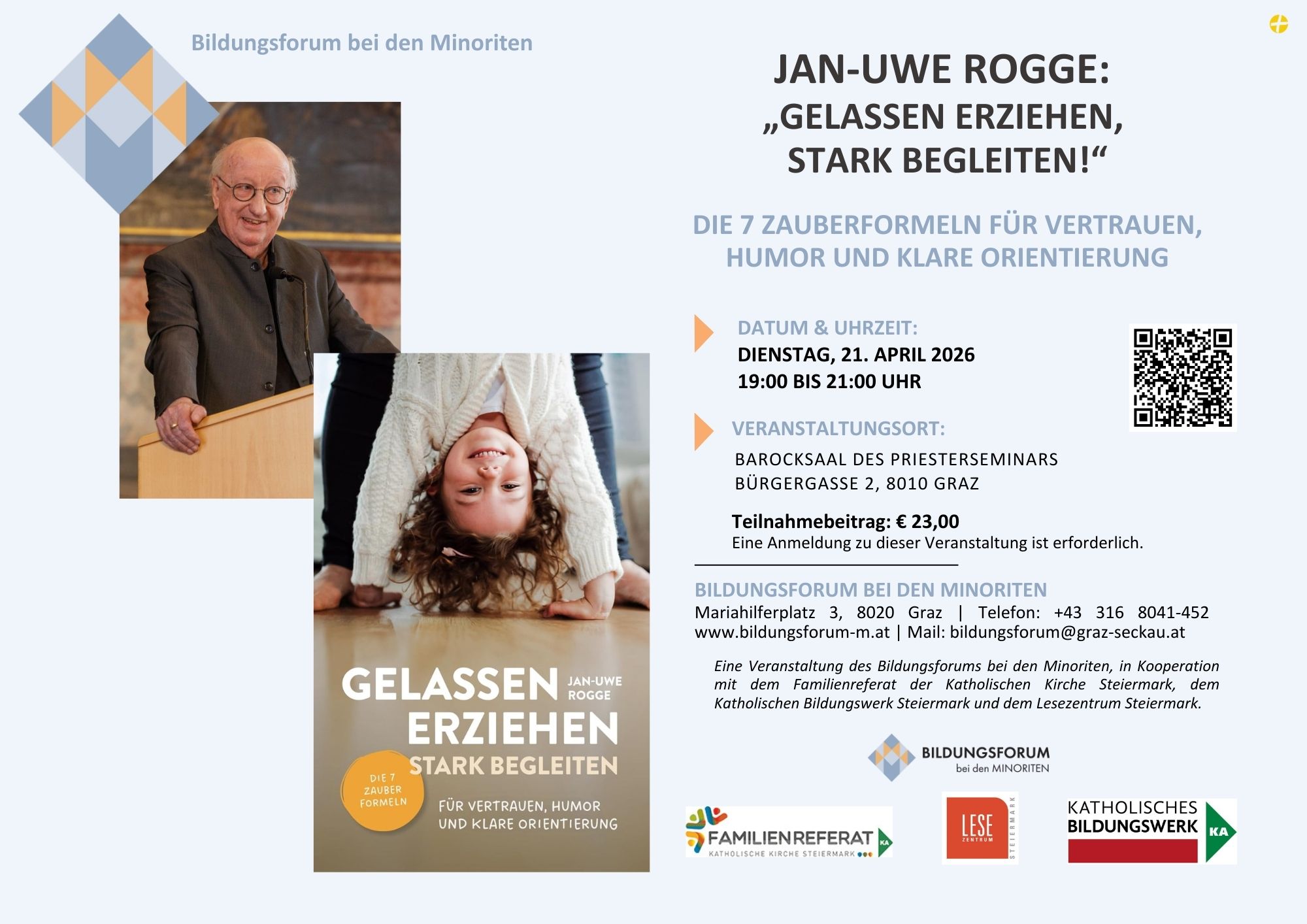 Haben Sie manchmal das Gefühl, dass der Druck, alles richtig zu machen, Ihre Freude am Elternsein überschattet? Fühlen Sie sich von den widersprüchlichen Erziehungsratschlägen aus Ihrem Umfeld überfordert und/oder sehnen Sie sich danach, gelassener und sicherer im Umgang mit Ihrem Kind zu werden? – JAN-UWE ROGGE, Bestsellerautor und Deutschlands bekanntester Erziehungsexperte, präsentiert – erstmalig in der Steiermark! – sein jüngstes Buch (2025) und gibt klare Antworten! Er zeigt, wie Sie die hohen Erwartungen hinter sich lassen, endlich eine neue Richtung einschlagen und dabei trotzdem eine starke, liebevolle Beziehung zu Ihrem Kind aufbauen können.