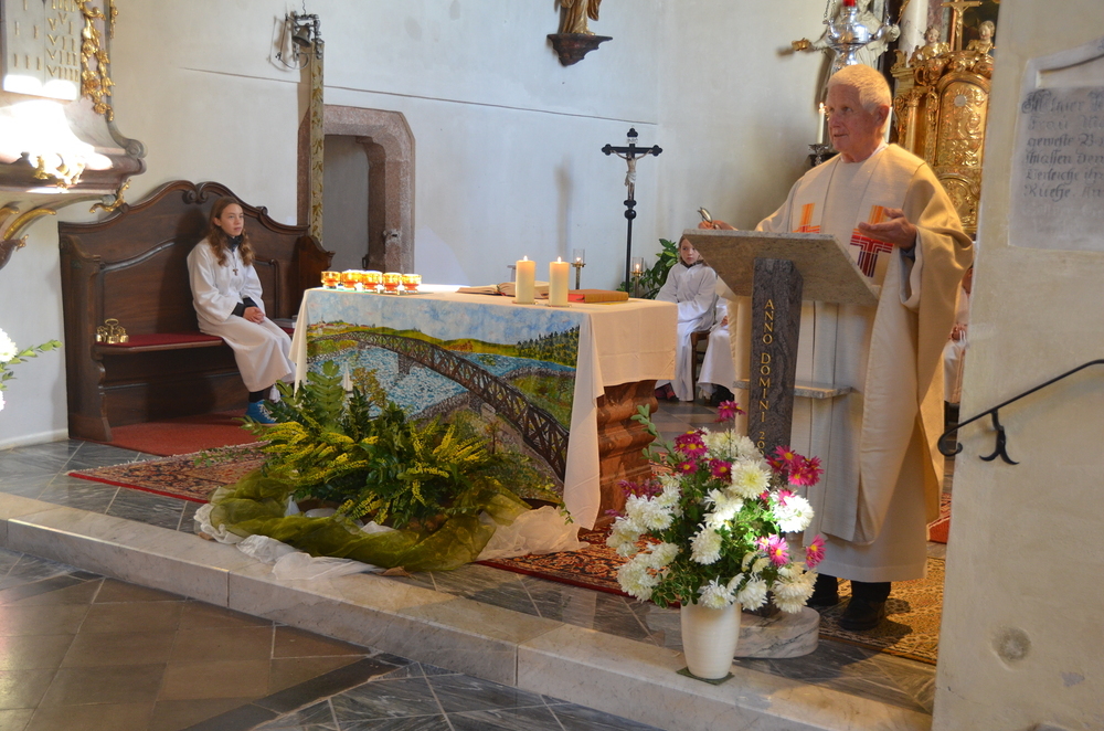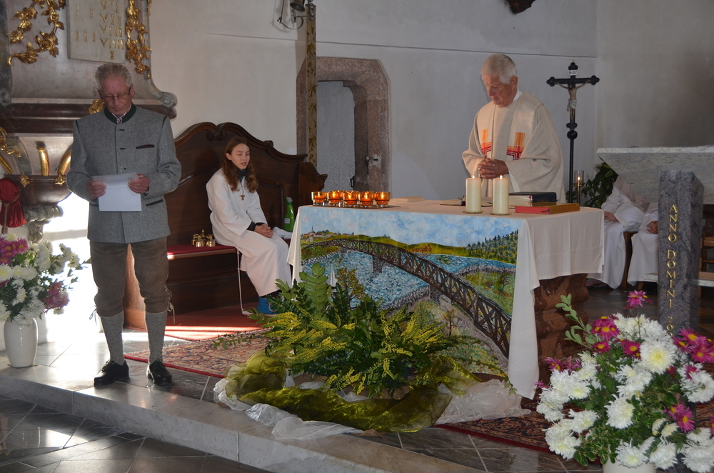 Bei der Allerheiligenlitanei wurden die Heiligen unserer Filialkirche angerufen, wobei die Ministranten auf ihr Bild dabei zeigten.