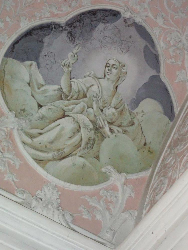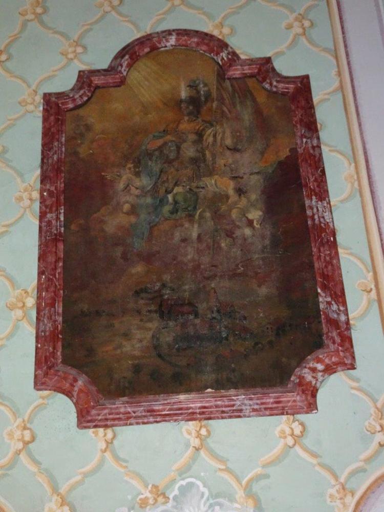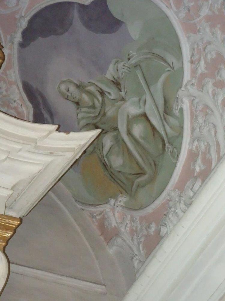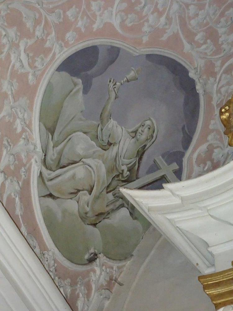 Der Kapellenraum besteht aus einem Tonnengewölbe mit zartem, besonders reich ausgebildetem Rokokostuck, der den italienischen Einfluss verrät. Die beiden Bildfelder sind mit Szenen aus dem Leben des Heiligen ausgestattet und stammen ebenfalls vom Künstler J.A. Mölk. In den vier Ecken befinden sich Bildfelder in Grau-Weiß-Schwarz-Maltechnik mit der Darstellung der drei göttlichen Tugenden (Glaube, Liebe, Hoffnung) sowie einer Pieta.