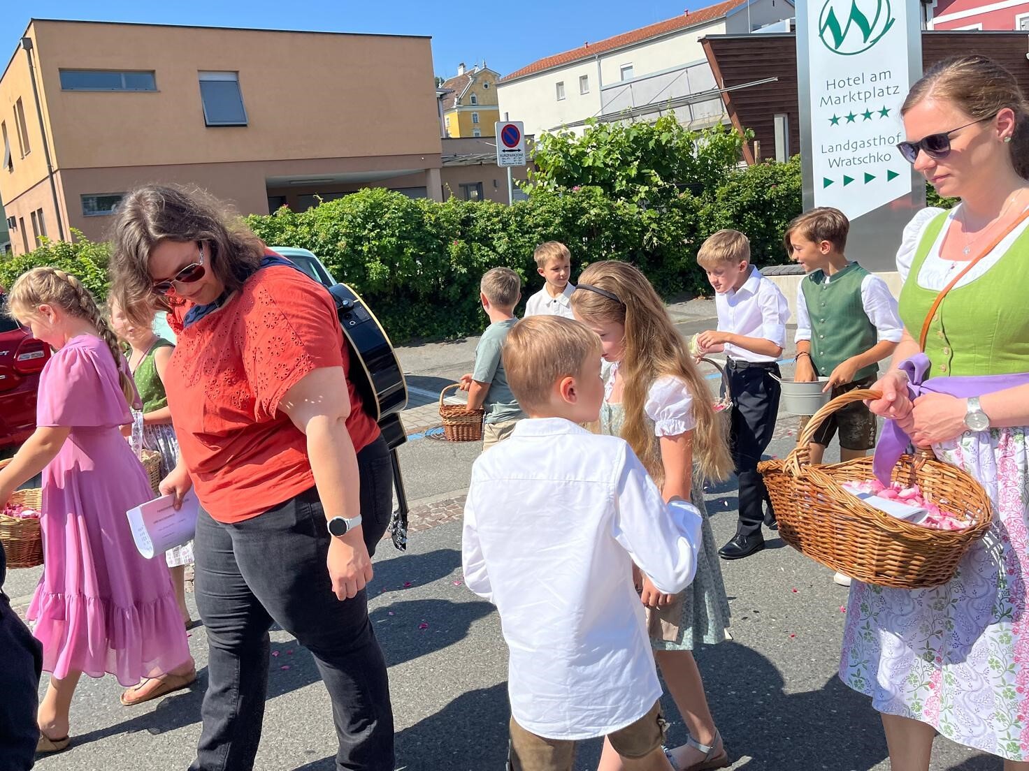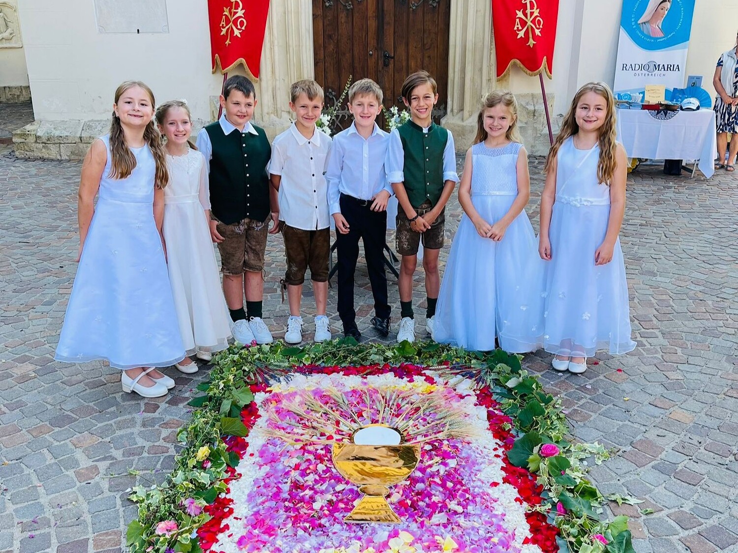 Danke auch allen Eltern für den wun­der­schö­nen Blu­men­tep­pich vor der Kir­che und die Be­glei­tung der Kin­der zu die­sem Hoch­fest.