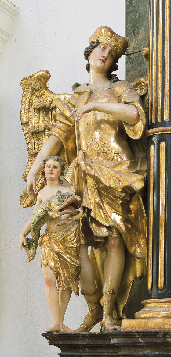 Der Michaelsaltar entstand laut Inschrifttafel 1751 anstelle eines Altares aus dem Jahre 1620. Das von Anton Jandl 1770 gemalte Altarblatt zeigt den Erzengel Michael als Patron der Sterbenden und Geleiter ihrer Seelen. Michael schwebt mit dem Flammenschwert in der Stube eines Sterbenden, der gerade von einem Priester seine Letzte Ölung erhält. Zwei weitere Erzengel sind seitlich auf Konsolen zu sehen. Links Raphael, der seit dem Mittelalter als Inbegriff des Schutzengels gilt. So bedeutet sein Name übersetzt: Heil von Gott. Der Knabe zu seinen Füßen ist Tobias, den Raphael vor einem Fisch rettete. Dessen Galle gab später dem Vater des Knaben das verlorene Augenlicht zurück. Deshalb wird Raphael auch als Patron der Ärzte verehrt.