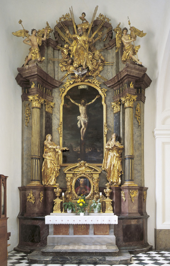 Der Kreuzaltar im Süden entstand 1771 im Zusammenhang mit der Neugestaltung der Kirche nach 1769. Er umschließt ein älteres Altarbild mit dem Gekreuzigten aus dem 17. Jahrhundert, das sich mit den beiden flankierenden, vergoldeten Figuren Mariens und Johannes des Evangelisten zu einer Kreuzigungsgruppe zusammenfügt. Auf diese bezogen ist die Skulptur Gottvaters im Zentrum des Altarauszugs. Zusammen mit der Taube des Heiligen Geistes schwebt er vor einer Wolkengloriole mit Strahlenkranz.
