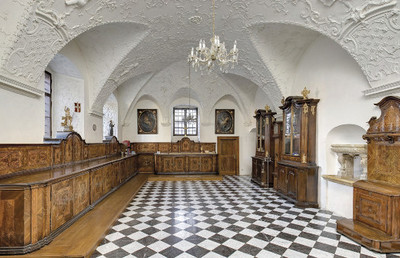 Der im Westtrakt des äußeren Hofes befindliche Saal ist das ehemalige Sommerrefektorium der Klostergemeinschaft. Er wurde durch die Stiftung von Fürst Johann Seyfried von Eggenberg (*1644; †1713) ermöglicht und ab 1691 nach Plänen von Joachim Carlone (*1653; †1713) errichtet.