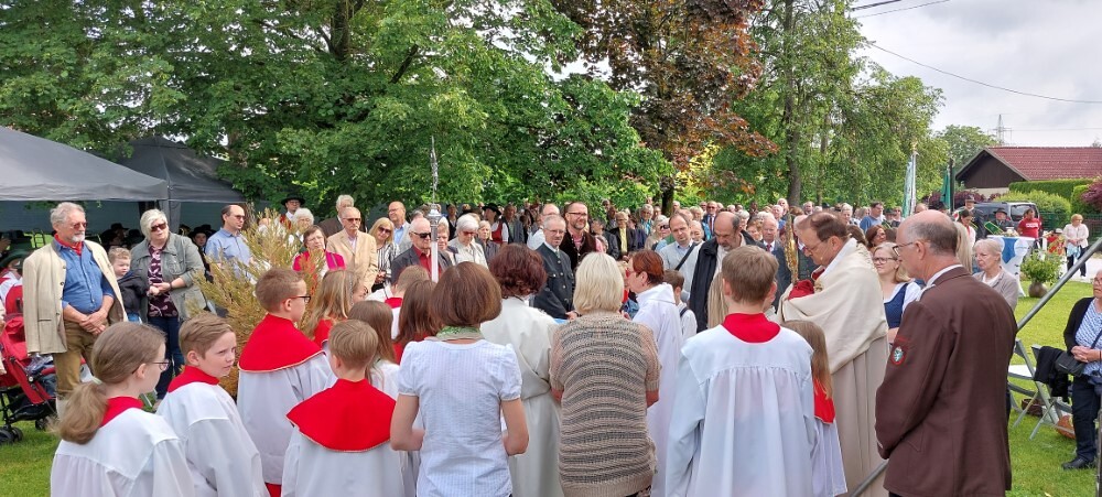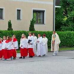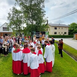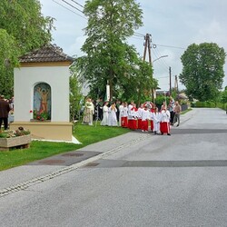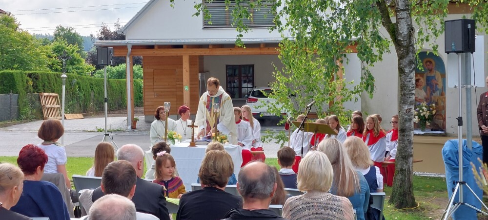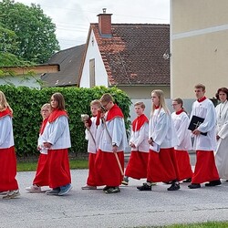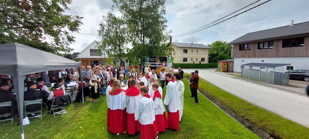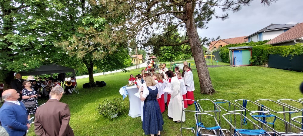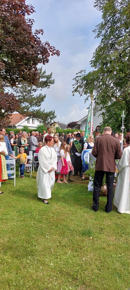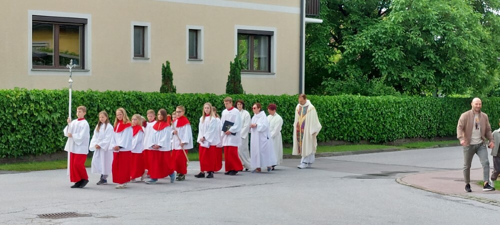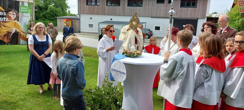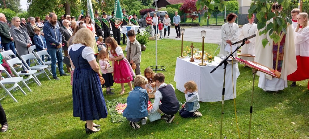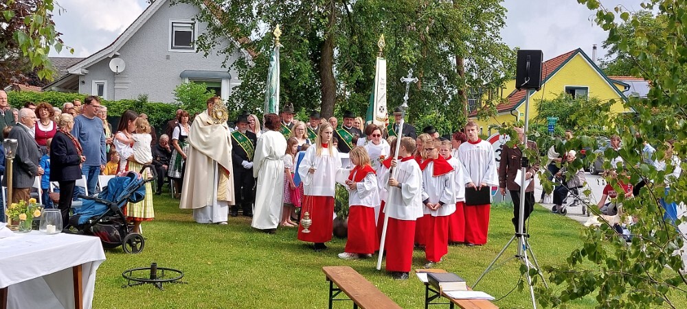 Im Anschluss an die Hl. Messe, zelebriert von Vikar Gerhard Hatzmann und begleitet von Kantorin, Lektoren und liturgischen Diensten beider Pfarren, fand eine Andacht bei den vier Stationen am Dorfplatz statt. Für die kleine Prozession waren vier Brottische als Altäre gerichtet, als Sinnbild für die vier Himmelsrichtungen und dafür, dass Christus der Heiland der ganzen Welt ist. Im gemeinsamen Liedruf "Brot des Lebens" zogen die liturgischen Dienste und die Kinder stellvertretend für das Volk Gottes zu den vier Altären: Brot der Liebe – Brot der Versöhnung – Brot des Friedens – Brot der Hoffnung. Zum Abschluss erteilte Vikar Hatzmann den Eucharistischen Segen, verbunden mit der Einladung, das Allerheiligste gemeinsam zur Kirche zu begleiten. Die Feier schloss mit dem gemeinsam gesungenen "Te Deum" ab. Zu den Feierlichkeiten waren auch die Vereine wie Feuerwehr und ÖKB eingeladen.